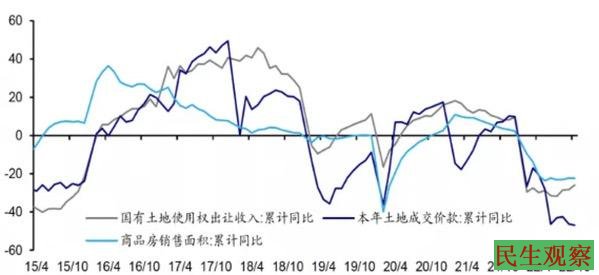 2022年以来,随着房地产销售面积步入负增长,房企拿地积极性转弱,使得土地市场遇冷。今年前10个月,土地成交价款累计同比回落46.9%。而相关税收以及政府性基金收入也随之下滑。一方面,在第一本账,契税、土地增值税累计增速分别降至-25.4%、-8.3%。另一方面,在第二本账,政府性基金预算收入同比增速-22.7%,其中国有土地使用权出让收入同比下降25.9%。这也意味着地方财政面临较大压力。