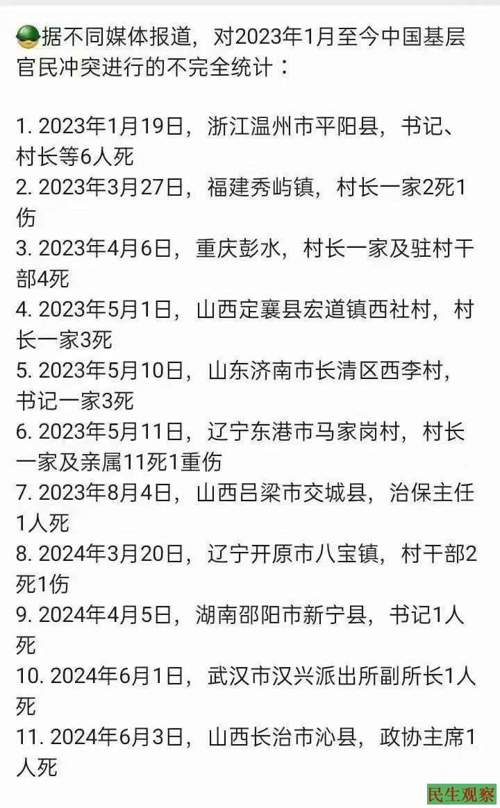 据不同媒体报道,对2023年1月至今中国基层官民冲突进行的不完全统计: