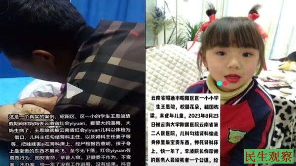 根据“王思竣妈妈”所诉和视频文字内容显示,去年8月,云南昭通市昭阳区一小学8岁的王思竣,与妈妈一同去云南红会医院看望生病的大妈,王思竣并不是来看病,竟被医院的儿科“以体检为借口”欺骗,他们互相勾结,2023年8月23日“把娃娃害si(死)在肾科床上”,尸检报告查明,“孩子身上最宝贵的东西不翼而飞”,疑似器官被活体摘除。