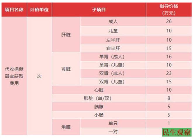 按照河南省的收费标准,单次代收捐献器官获取费用,成人肝脏指导价为26万元,儿童为10万元,左半肝为10万元,右半肝为15万元。成人单肾指导价为16万元,双肾为23万元;儿童单肾为10万元,双肾为15万元。心脏指导价为10万元。肺脏(单/双)指导价为8万元。胰腺指导价为5万元等。