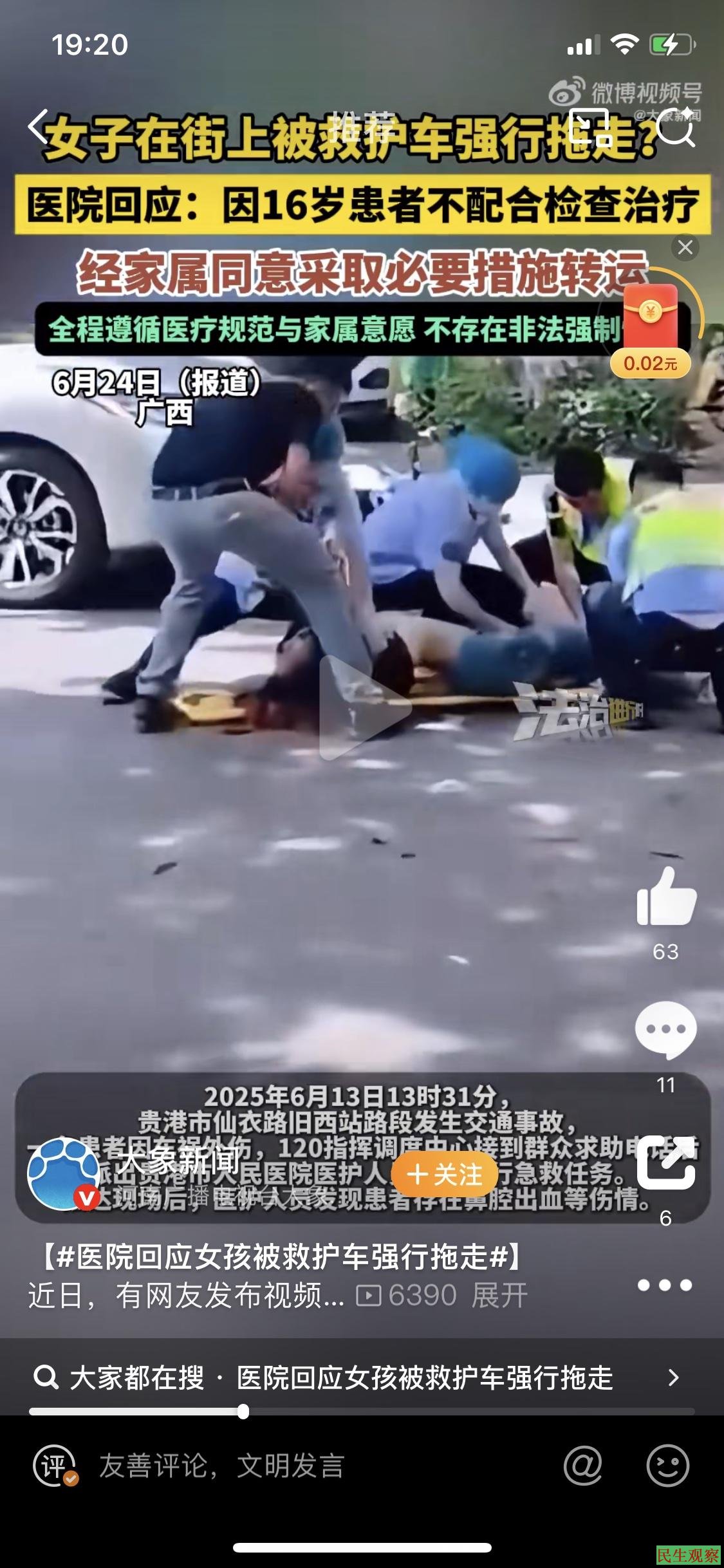 贵港16岁女孩被救护车强制拉走全网等待女孩平安辟谣