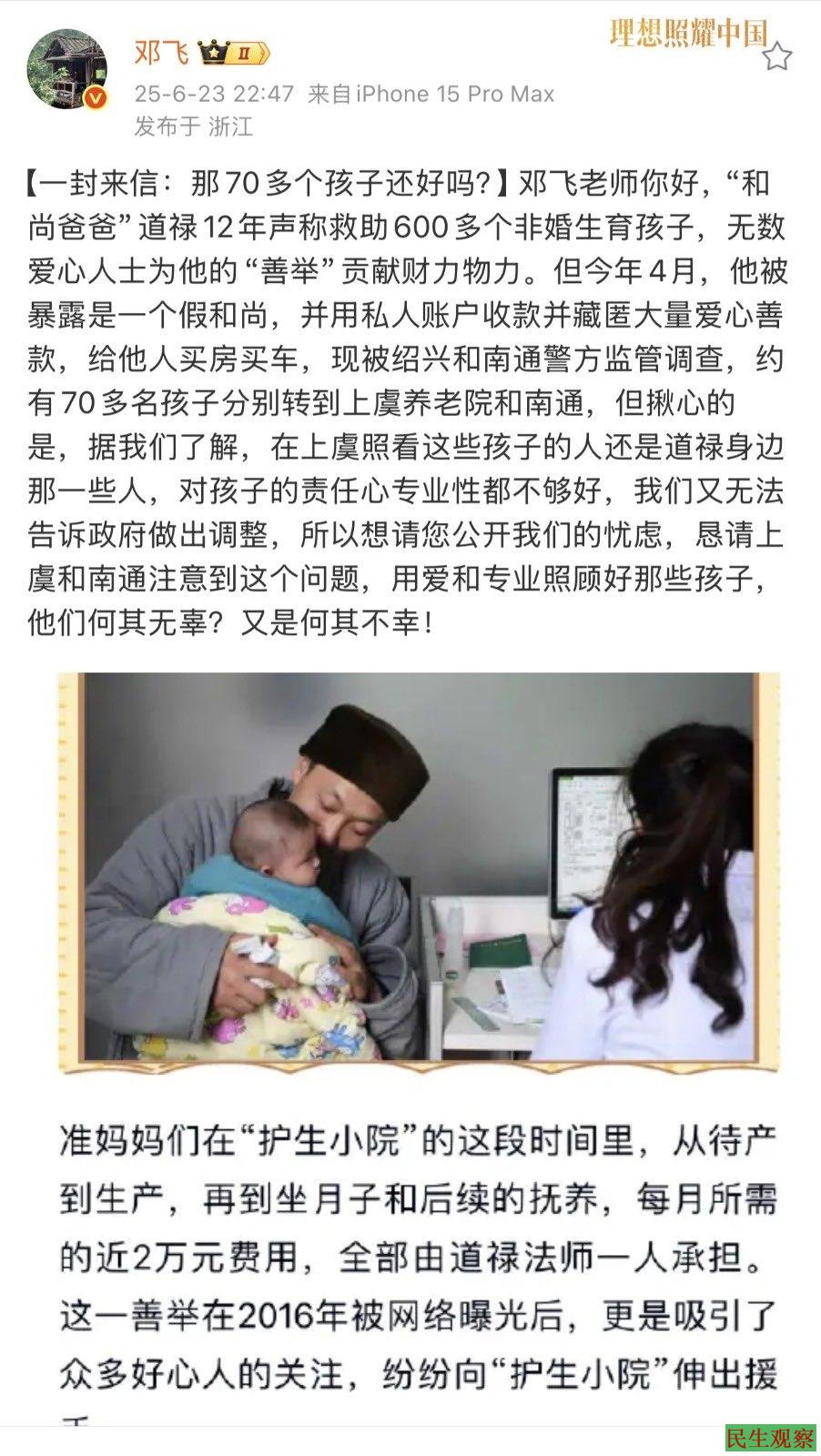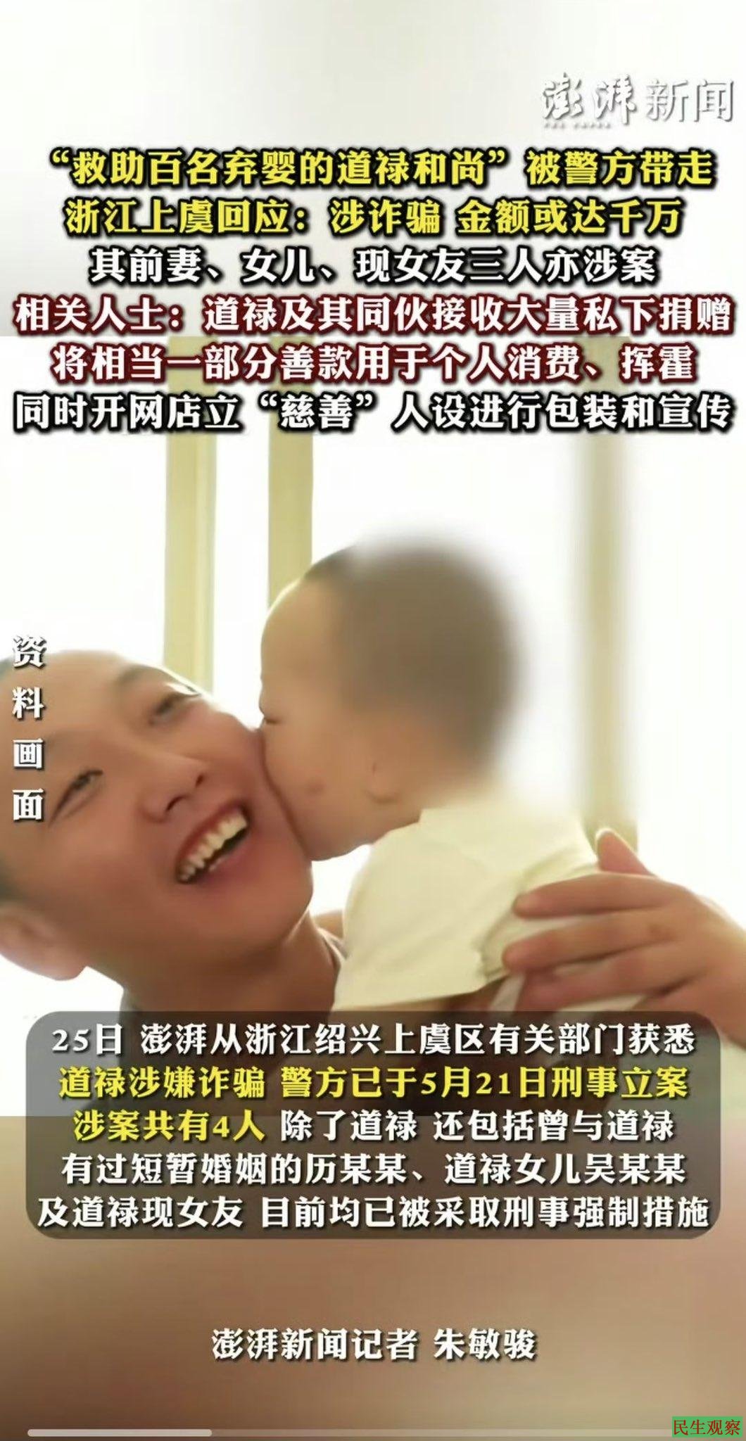 6月26日,浙江绍兴上虞公安发布警情通报:自2018年以来,道禄以“资助孕妇、助养儿童”为名大量接受社会捐赠,涉案金额或逾千万元,善款大多用于个人高消费,涉嫌诈骗犯罪被采取刑事强制措施,道禄还涉嫌包括收养程序违规(如单身男性收养女婴违反年龄差规定)、伪造户籍材料等。消息一出,舆论瞬间沸腾。皋市民政局党组成员、副局长殷高林:由于“护生小居”不是登记在民政局下面的机构,民政局不掌握护生小居的具体情况。“近两年,民政局没有与道禄或护生小居相关的收养流程记录。”网友质疑:从救助600多名弃婴到涉嫌诈骗,在这片土地真是善行难,民间慈善社更难。一个运营十余年、救助上百名弃婴的机构,拥有近千万流动资金真的不合理吗?道禄和尚是动了谁的蛋糕了?为什么那么多慈善基金会没人查?