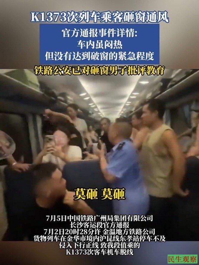 面对汹涌舆论,中国铁路广州局集团有限公司长沙客运段7月5日做出通报声明。针对砸窗自救的情况,声明给出的解释是:车内虽闷热但没达到马上开启车门和破窗的紧急程度。即便如此,对于该名乘客的“鲁莽行为”,官博表示已经对他“批评教育”。另外着重表扬了车上员工如何在时候给安抚乘客的行为。结果为负面舆论添一把柴火,招致更多愤怒和批评。