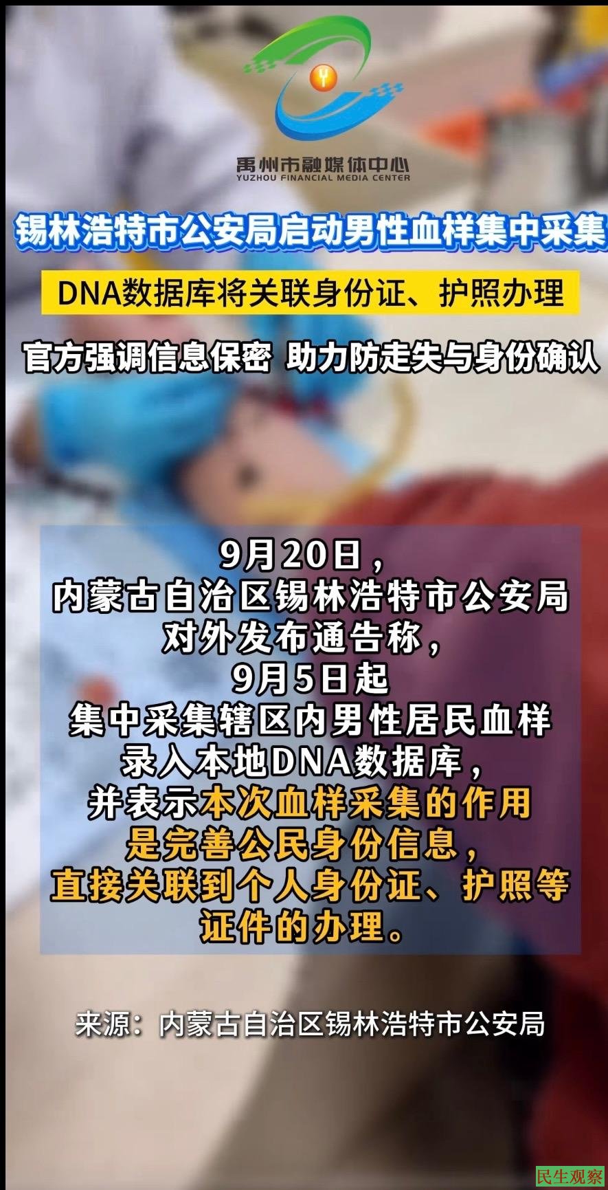 9月20日,内蒙古自治区锡林浩特市公安局对外发布通告称,9月5日起集中采集辖区内男性居民血样录入本地DNA数据库,并表示本次血样采集的作用是完善公民身份信息,直接关联到个人身份证、护照等证件的办理。对于防范老人儿童走失、人员身份信息确认等方面,具有重大作用。采集过程严格遵循相关规范,居民个人信息及生物样本将依法严格保密,确保信息安全。