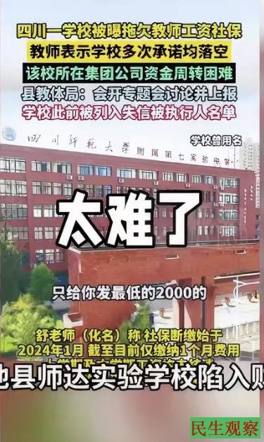 四川省近期曝出多名教师集体发声,控诉被长期拖欠工资和社保缴费。事件迅速引发社会关注。四川岳池县师达实验学校(民办),在校学生3533名。隶属于四川冬石教育管理集团。自2024年1月起,持续近两年,全校325名教师遭长期欠薪,社保断缴。2025年9月新学期收取的约4000万元学费,被集团挪用。教师曾通过劳动仲裁、法院诉讼胜诉,但学校以“集团无资金”为由拒不执行。:岳池县教体局回应“情况属实”,并强调“民办学校工资由企业自主负责,干预作用有限”。此次事件暴露了民办教育监管的缺位,集团公司将学校作为融资工具,教育资金与其他项目混同管理,债务风险传导至师生。网友评论:这不仅仅是经济问题,更威胁到教育事业的根基和教师群体的尊严。想象一下,辛勤耕耘于三尺讲台的老师们,竟因“薪水不翼而飞”而陷入生活困境,这直接折射出教育管理中的深层漏洞。令人心痛的是教育沦为资本最脆弱的牺牲品,民办学校便成了房地产等资本的“提款机”。民办学校欠薪是法治与监管不到位的畸形产物,若放任其常态化,将既损害教师基本权益,也破坏教育生态和市场信用,最终伤害的是学生受教育权。有关部门必须加强财务监管,建立风险预警机制,实施常态化审计,以制度保障教师权益,不能因“民办”性质而置身事外。