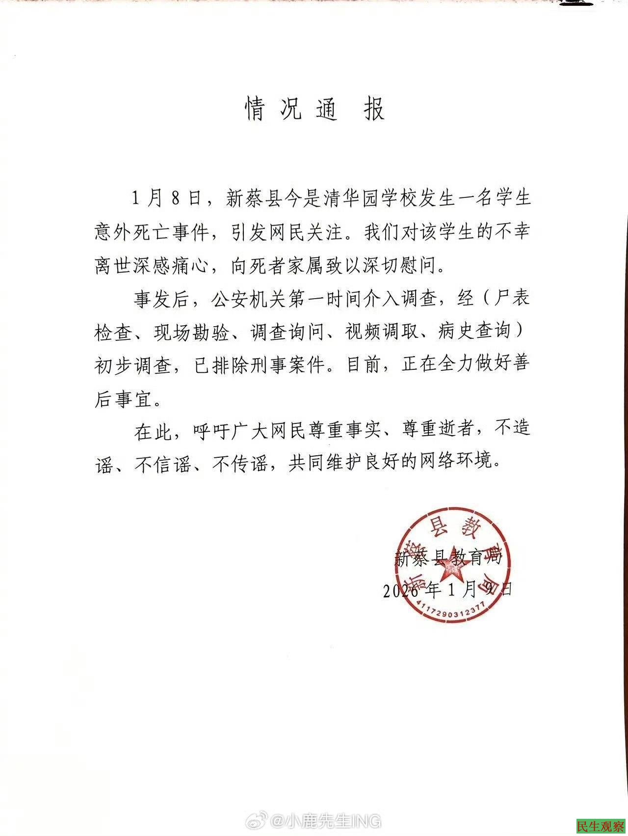 白di追光者:为什么总是这么快就排除刑事案件?2026年1月8日凌晨,河南新蔡县一民办寄宿学校14岁高一男生宿舍身亡,家属因遗体存在异常伤痕、校方延迟45分钟通知且试图在家长未到场时转运遗体提出质疑,官方通报排除刑案但未解释核心疑点;事件暴露民办寄宿校安全巡查、应急通报机制漏洞,舆论呼吁落实监护人到场前不移遗体、第三方尸检等程序正义。希望有一个公平的回应。