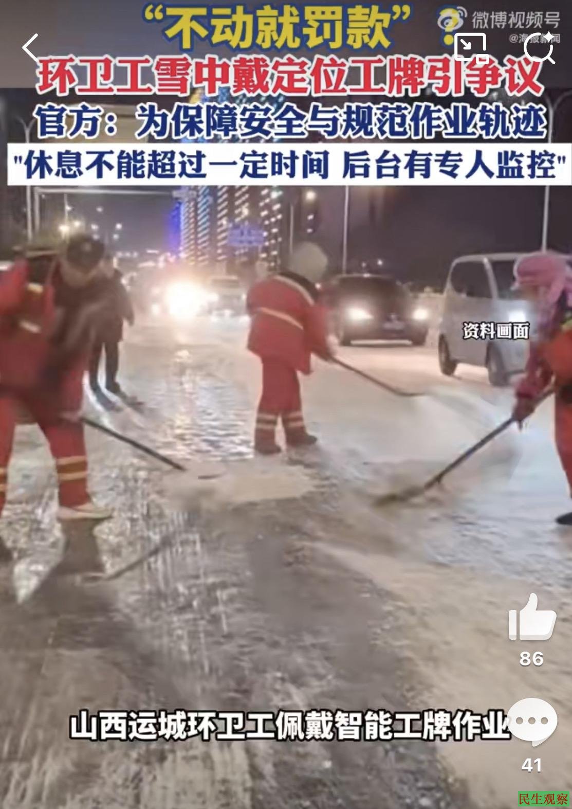 2026年1月19日,山西运城遭遇暴雪,有网友询问冒雪作业的环卫工“为何不歇息”,工人直言佩戴的定位工牌会监测静止状态,“不动就要被罚款”。这段对话视频迅速引发全网热议,直指技术管理对基层劳动者的压迫。官方强调“保障安全”。多数网友将工牌比作"无形枷锁""电子镣铐",质疑其从安全工具沦为绩效管控手段。对比指出同类设备多用于高危行业防护或性犯罪者监管,用于环卫工管理涉嫌过度监控;暴雪中工人冒雪作业与"后台监控罚款"机制形成强烈反差,被批"技术失去温度"。管理方将“安全保障”与“轨迹监控”混为一谈,而工人群体(多为中老年人)缺乏议价能力。安全防护仅需定位功能,“轨迹考核”实为绩效管理,二者性质混淆折射权责错位。官方称定位工牌是安全保障、辅助管理,主管与车辆也同步配备,并非一刀切罚款,却也承认对休息时长设限、后台专人监控,这种表述让一线工人的不安被无限放大。科技本应是环卫工的“安全盾”,高龄从业者在道路作业,定位功能本可在突发状况时快速响应,可一旦变成紧盯停留时长的“电子监工”,就彻底偏离了初衷。月薪不足三千的他们,顶着严寒劳作,连安心歇会儿的权利都要被数据监控,这份苛责远比风雪更寒心。城市管理的精细化,从不是用技术把劳动者困在轨迹里,也不该是用监控替代人文关怀。与其在定位数据上斤斤计较,不如先落实保暖装备、合理轮休与薪资保障,让环卫工的付出被看见、被尊重。技术的温度,终究要体现在对基层劳动者的善待上,而非冰冷的考核数字里。
