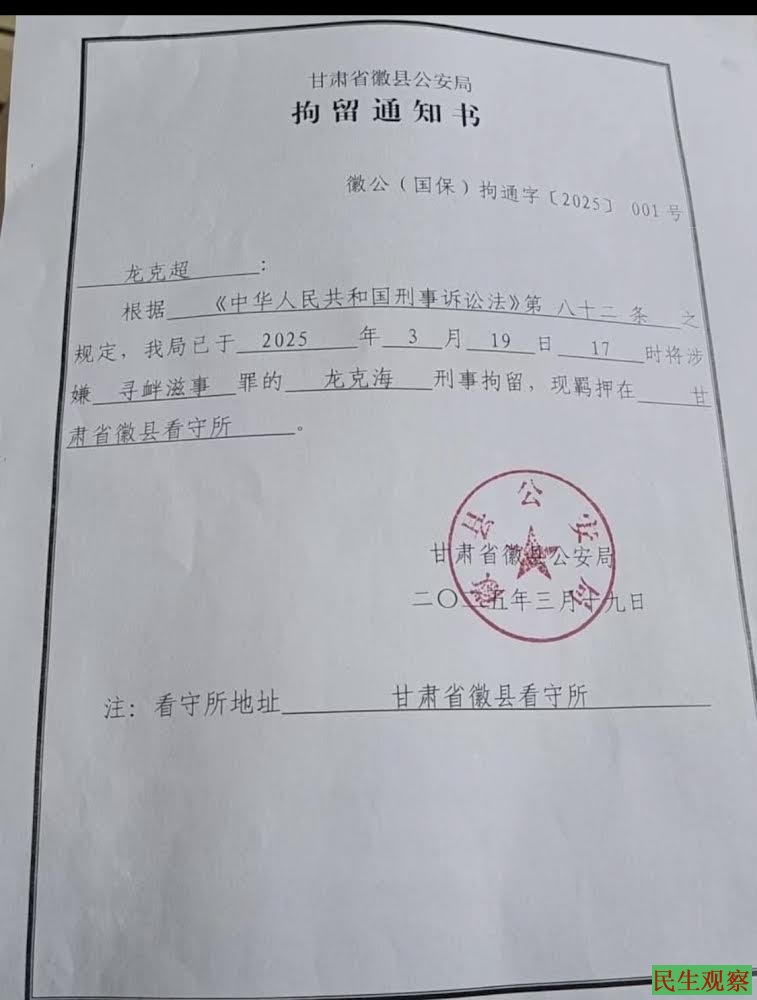 2025年3月19日晚21点20分左右,从成都秋雨圣约教会会友龙克海弟兄的儿子那里获得其最新消息,龙克海弟兄已于3月19日下午17时,被甘肃省徽县公安局以涉嫌“寻衅滋事罪”刑事拘留,现拘押在甘肃省徽县看守所。