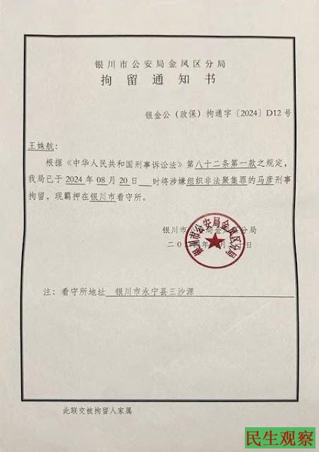 8月20日,家人收到金凤区警方对马彦的解除行政拘留通知书,但转而又被以涉嫌“组织非法聚集罪”刑事拘留,并直接送银川市看守所关押;