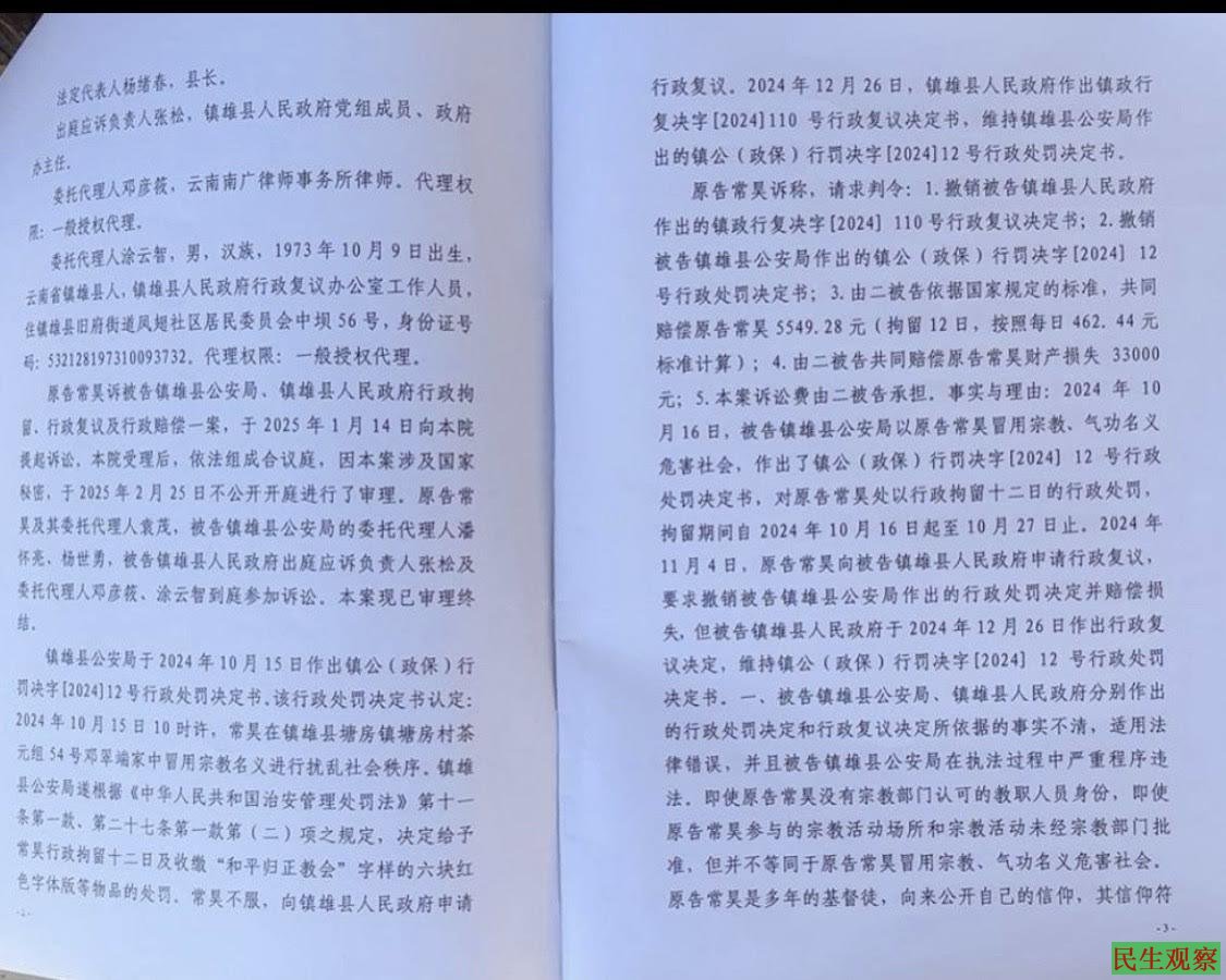 【民生观察2025年3月28日消息】云南省镇雄县常昊传道因不服公安机关的行政拘留处罚而发起诉讼。近日,常昊传道收到了云南省镇雄县人民法院的行政判决书,结果是驳回诉讼。书记员问常昊服不服,常昊说不服,他还要上诉,书记员让常昊签字盖手印后拿走了判决书。