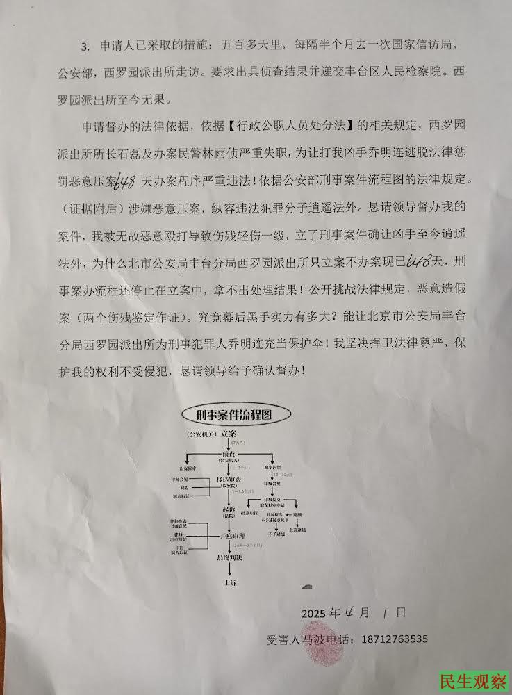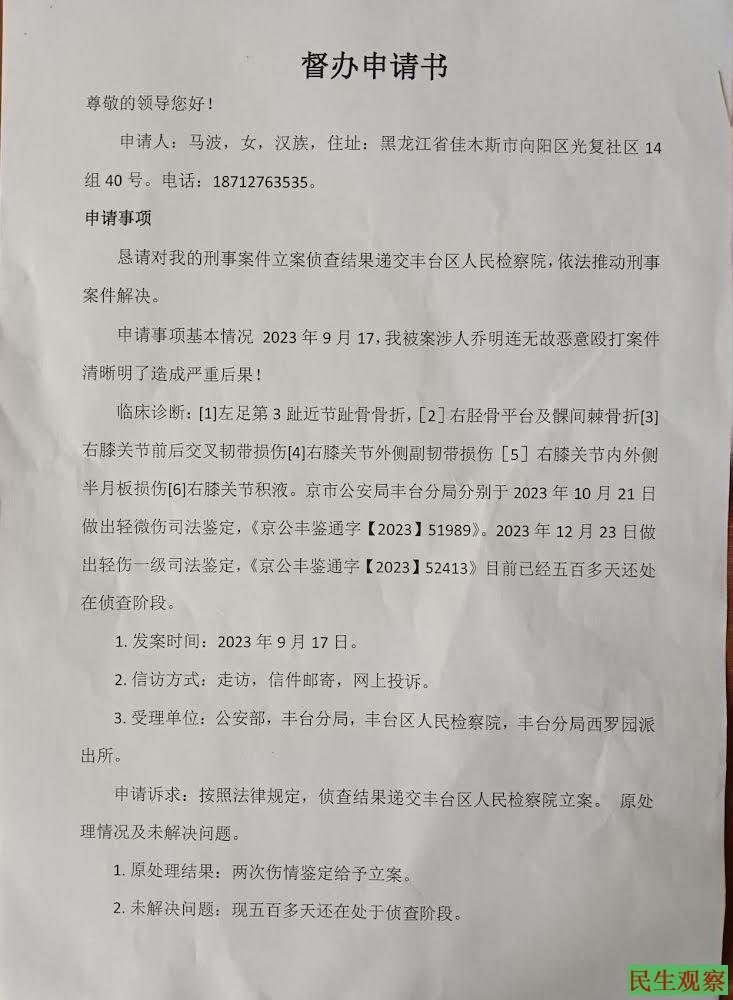 【民生观察2025年4月4日消息】黑龙江佳木斯维权访民马波,于2023年9月17日在京时被一个叫乔明连的男子殴打,致其身体伤残。对此,北京警方立了刑事案件,但打人凶手至今未获惩罚。近日,马波向北京丰台检察院递交了书面监督申请,要求其监督北京市公安局丰台分局西罗园派出所对该案进行立案侦查。