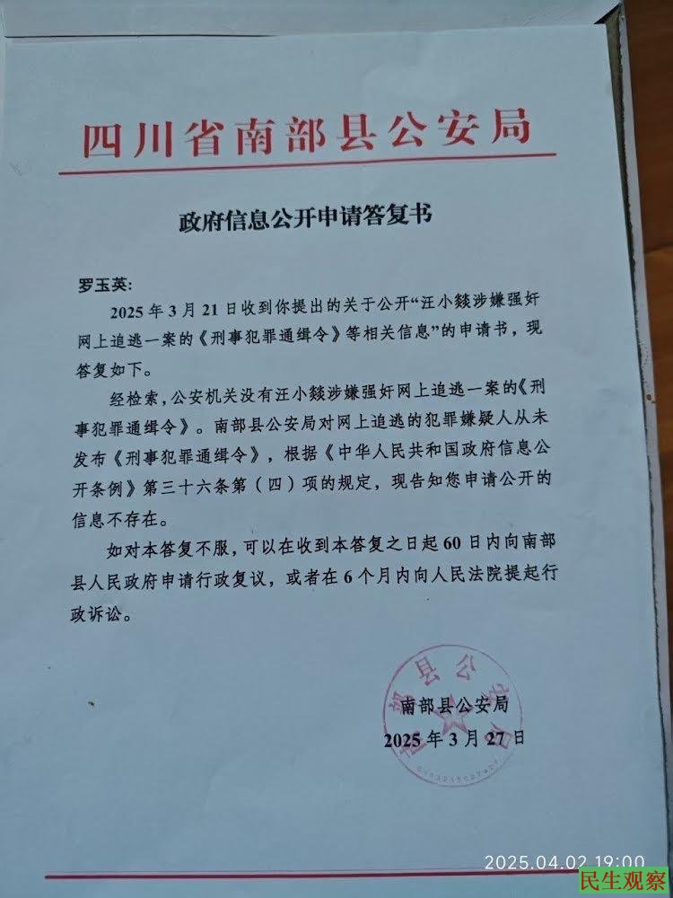 【民生观察2025年4月9日消息】四川省南充市南部县罗玉英儿子汪小燚在部队被军官虐待体罚、殴打致残,部队却用欺骗手段把孩子档案交给父母,遗弃不管,后经过家属多次上访,部队和家属达成协议,但签字后部队却出尔反尔不兑现承诺。2005年,汪小燚因涉嫌强奸罪被南部县公安机关列为网上追逃,新案旧案一起,导致母亲罗玉英为此上访二十多年却无解决希望。近日,罗玉英递交申请,要求政府公开“汪小燚涉嫌强奸网上追逃一案的《刑事犯罪通缉令》等相关信息。随后南部县公安局向罗玉英出具了政府信息公开申请答复书,称其申请的公开信息不存在,汪小燚不是通缉犯。