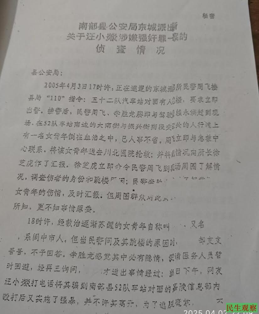 2005年8月14日,南部县公安局东城派出所出具了,关于汪小燚涉嫌强奸罪一案的侦查情况。