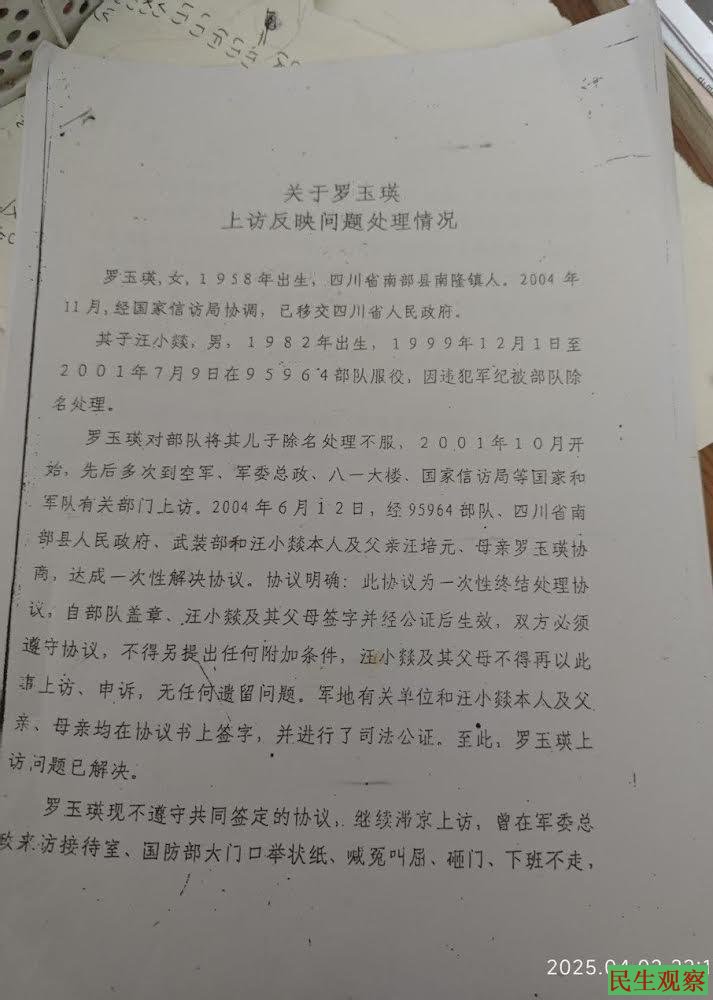 2023年12月4日罗玉英曾通过视频说:“我的儿子叫汪小燚,1999年在湖北广水入伍,是95829部队的空降兵,我儿子在部队里被军官非法体罚虐待,毒打致残,小便出血,精神受到刺激,部队欺骗我们父母,把孩子档案交给我们了,然后买通我们南部县的女县长祝琳(音)、武装部政委冯祥全、信访局局长张黎明,背着我们搞公证,搞信访终结,部队逃脱法律责任,地方不负法律责任,造成我们上访22年。