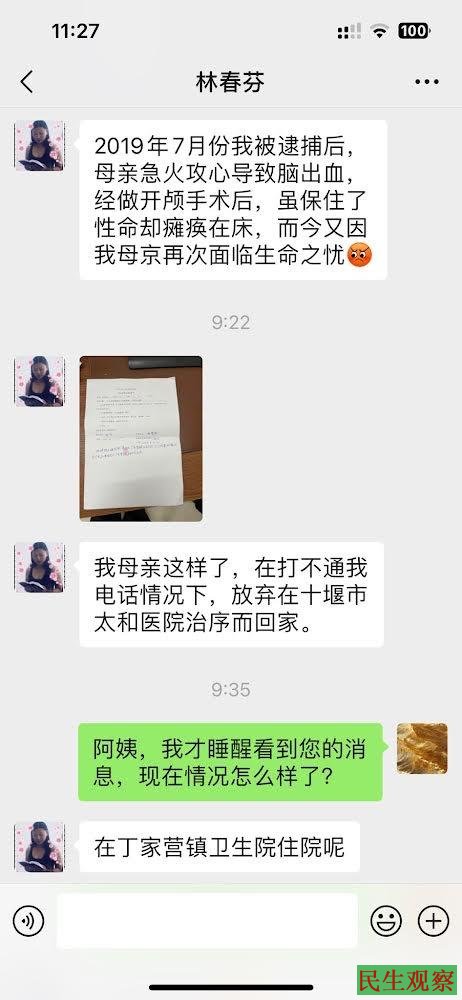 林春芬的母亲于2025年3月23日,因为急性脑梗住进十堰市太和医院治疗。在住院治疗期间,林春芬被十堰当局带走控制,手机被没收。