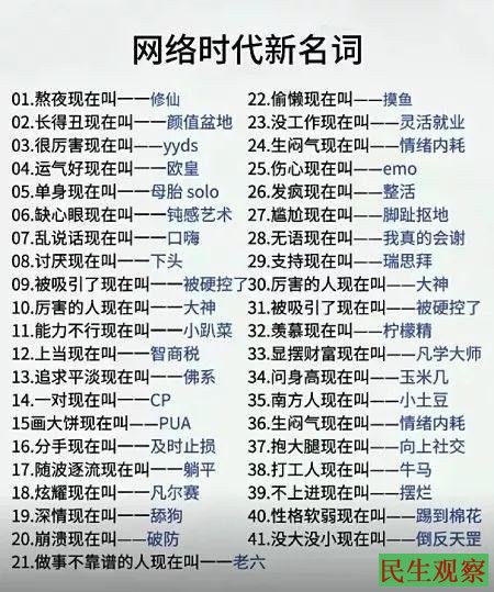 语言是社会的镜子。流行语作为一种独特的社会符号,折射出的时代特征十分鲜明,网络流行语是现实语言的延伸,直接反映了现实生活和大众心态。这41个网络时代流行语,是当代中国人特别是年轻人情绪与现实状态的一面镜子,从“打工人”到“牛马”,从“躺平”到“摆烂”,,每一个词都承载着一种情绪:讽刺、调侃、无奈,甚至是一种静默的反抗。这不是简单的网络流行语堆砌,而是集体情绪的表达。这些词语流行,不是偶然,而是社会现实的催化结果,是一个时代困境的缩影。