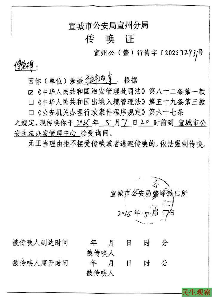 2025年5月7日下午18点左右,傅荣梅从北京乘火车到宣城市火车站,下火车后,随即被宣城市鳌峰派出所警察,强行带到宣城市公安局宣州分局,关押期间被强行非法搜身,并戴上手拷,做了询问笔录。