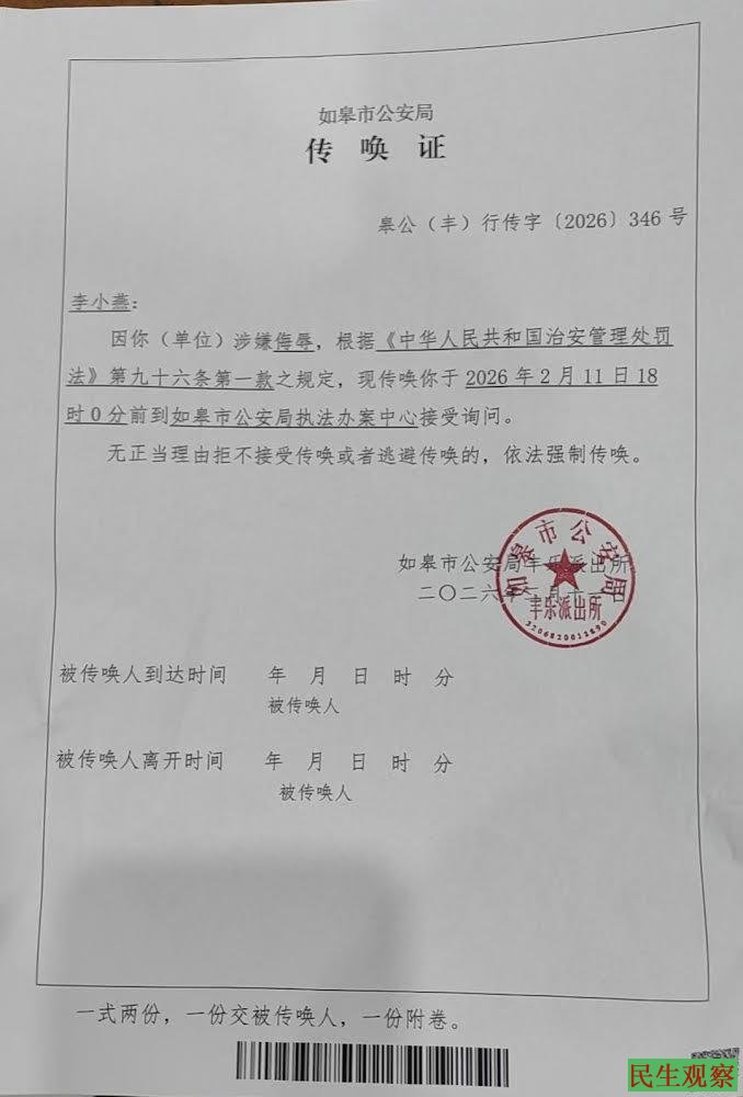近日,如皋市公安局出具传唤证,称李小燕因涉嫌侮辱,根据《中华人民共和国治安管理处罚法》第九十六条第一款之规定,现传唤李小燕于2026年2月11日18时0分前,到如皋市公安局执法办案中心接受询问。