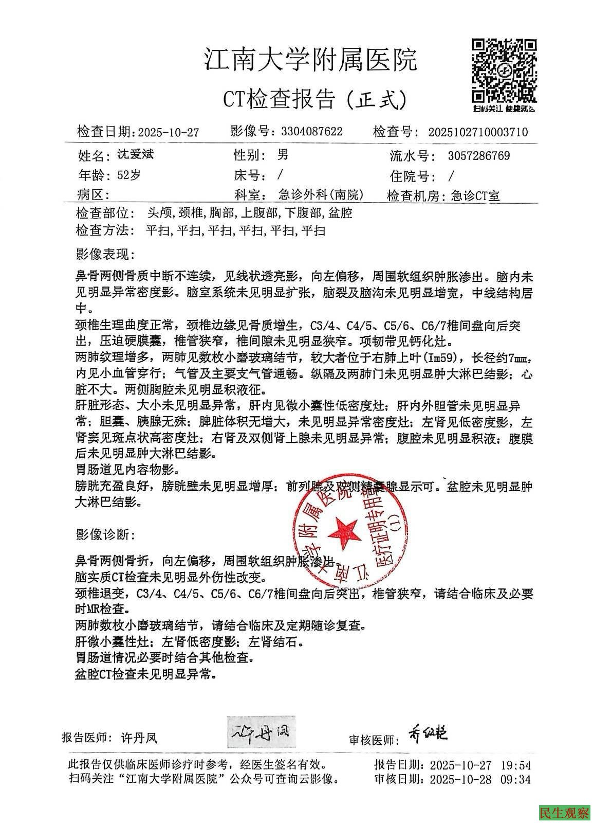 2025年10月29日下午再到医院,根据五官科医生要求,挂杜主任专家号确定鼻骨整形治疗方案,离奇的是,杜主任先说电脑里找不到CT资料,在沈爱斌一再坚持“拍了CT已经有报告了”,杜主任才很为难地找到了CT影像,但又说没有“鼻骨骨折”,沈爱斌等人觉得太不可思议了,坚持说“报告上写了双侧鼻骨骨折”,杜主任才再仔细看,终于说“哦,有骨折,两边有一个空隙”,最后却说“不要手术”,沈爱斌等人看到杜主任完全怪异的举动。