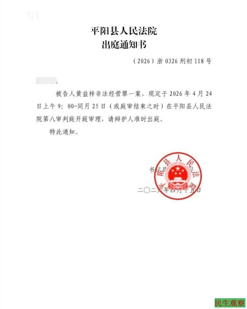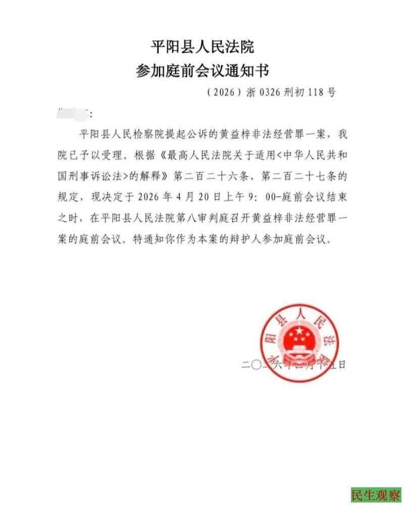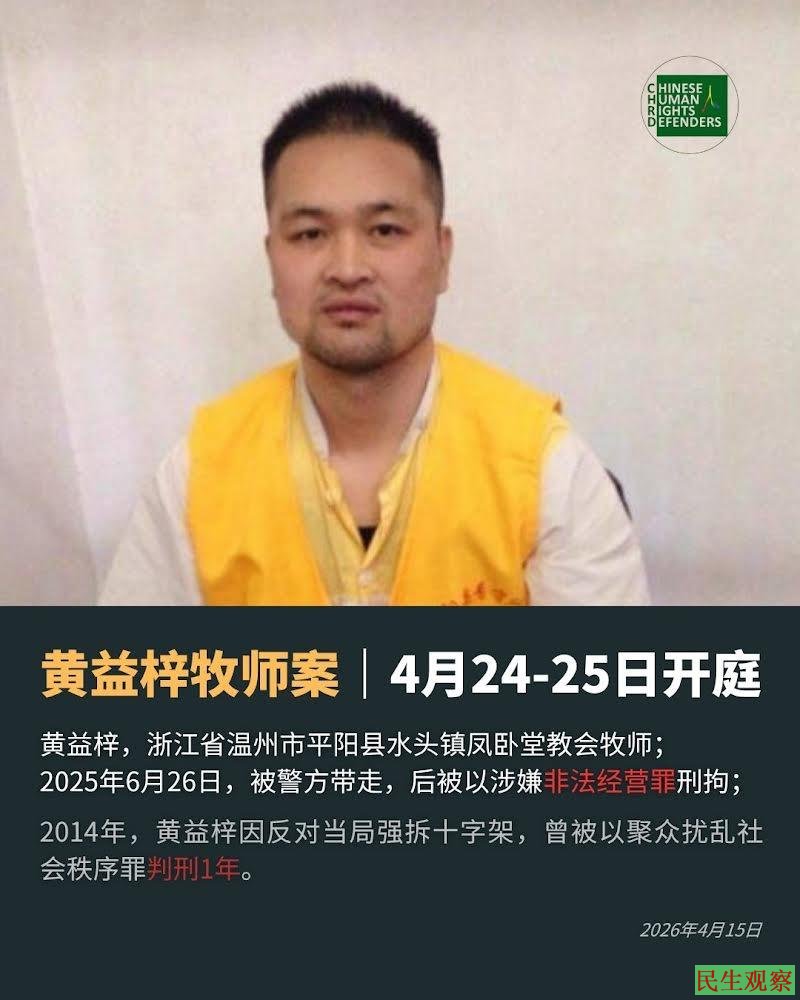 2026年4月20日上午9点,黄益梓牧师案将召开庭前会议;4月24日上午9点-25日,将在平阳县法院第八审判庭开庭审理。