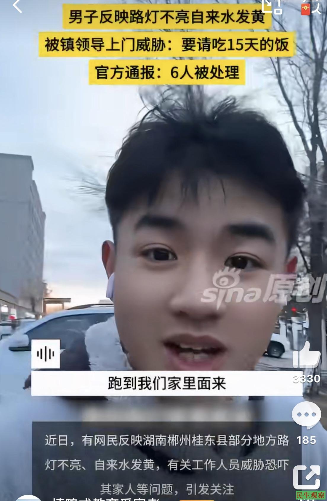 湖南郴州桂东县大塘镇村民黄先生在春节返乡时发现106国道旁数十盏路灯长期不亮,遂在社交平台发布视频反映问题,引发广泛关注。几天后,镇干部带领民警上门,要求其删帖,并被指威胁“联系不到本人就先拘留15天”。官方初期称镇政府人员上门为“普通协调工作”,否认威胁。后续通报认定,个别干部存在言语不当、态度生硬等问题……。舆论关注焦点:村民反映的是真实存在的民生问题,且未捏造事实,属合法行使监督权。动用镇干部、村干部及民警联合上门,被质疑为以“协调”之名行“施压”之实,尤其对年迈家属进行威胁,加剧了公众对“公权力压制舆论”的担忧。当地工作人员曾表示上门目的是“不要在网上发负面消息”,暴露部分干部将舆论监督视为“麻烦”而非改进契机的治理偏差。出动民警参与协调民生投诉,被质疑公权力滥用与“解决提问题的人”思维。村民反映问题半年未获整改,视频曝光后迅速推进,暴露基层治理被动应付问题。事件折射出基层治理中对群众监督权的认知偏差。反映公权力使用边界模糊。应严格区分"解决问题"与"解决提问题的人",杜绝滥用"维稳思维"。多位评论指出,基层治理应“修路灯”而非“修人”,面对监督应闻过则喜,而非“堵嘴了事”。